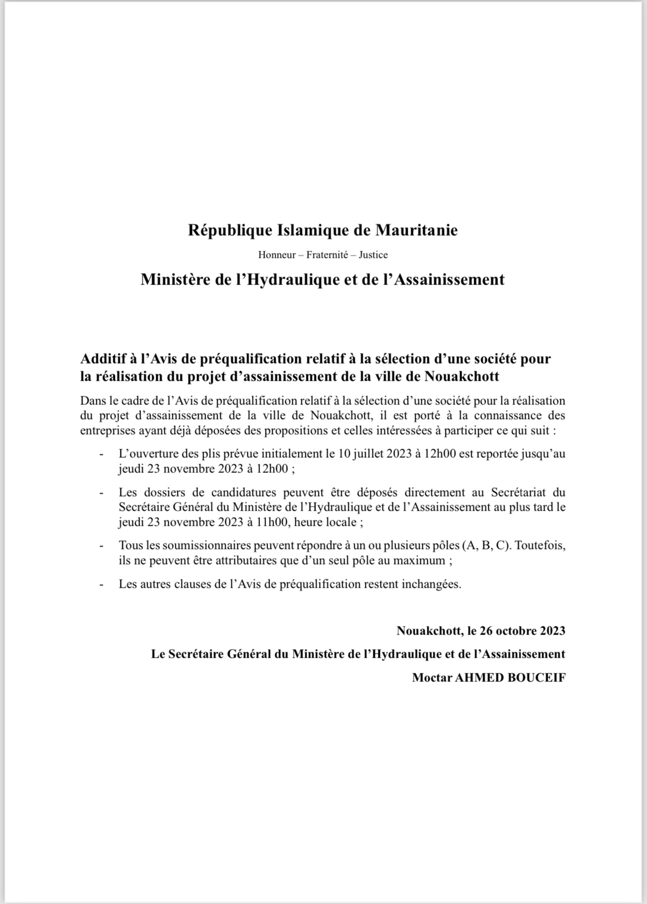 أدى معالي الوزير السيد إسماعيل عبد الفتاح،الثلاثاء، زيارة معاينة لعدد من نقاط تجمع المياه في العاصمة نواكشوط، حيث ستباشر الفرق الفنية التابعة للمكتب الوطني للصرف الصحي حملة لوضع حد لهذه الظاهرة.